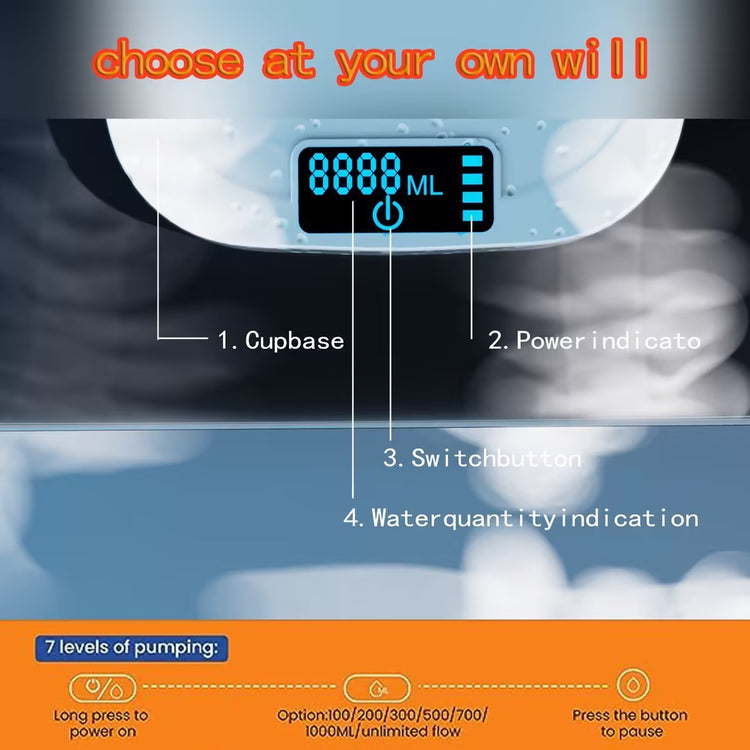 1. 【Smart】Smart with 8 levels of quantitative pumping, 8-stage capacity selection with indicator light (100ml, 200ml, 300ml, 500ml, 700ml, 1000ml, and unlimited flow), the electric water dispenser is suitable for various types of bottles (1~5 gallon).